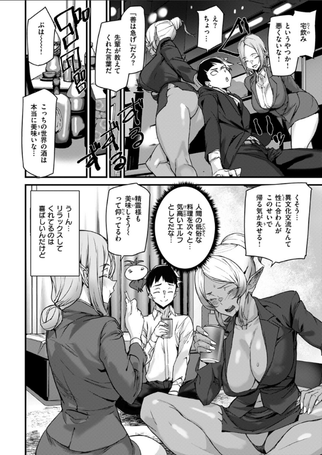 「お互いのこういう文化も教えあっちゃいましょうか♪」異世界への扉が開いてから数年が経った現代社会。人間と異種族たちは、次第に互いの社会へ溶け込み始めていた。新人教育係のアザミが任されたのは新たに入社した二人のエルフ、アイシャとルネ。まだまだ人間界の常識が分からない二人は、無自覚・無防備に下着も肌も晒してしまう日々。ある日、仕事終わりに宅飲みをすることになったアザミたちだったが、だんだん良い雰囲気になってしまい……互いの種族の愛情表現、そして生殖行為を確かめ合うことに……♪