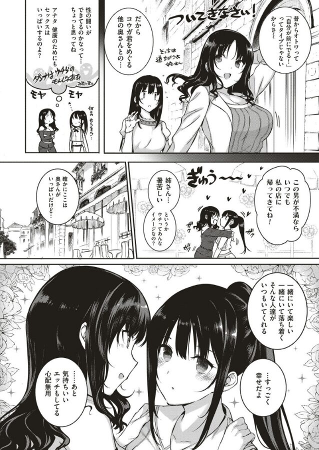 一夫多妻制の街アクアニアでコウガは5人の妻と一緒に喫茶店を経営している。妻の一人であるオトワは客に手を出されているコウガを目撃してしまい、休憩時間にコウガをお仕置きすることに…♪愛情たっぷりの手コキ、フェラチオ、スケベマ○コで熱いご奉仕。桂井よしあき先生の結婚性活はいつでも愛と汁が溢れてる☆